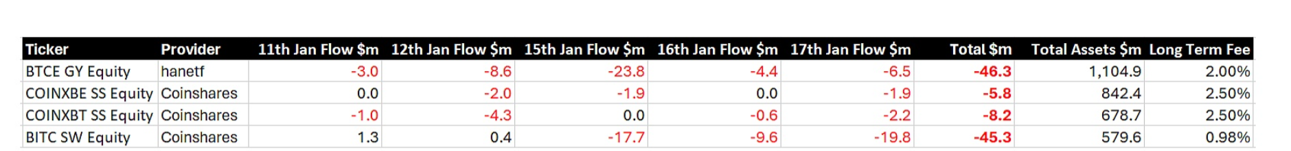 1月18日财经报道,BitMEX Research统计数据显示,在美国比特币现货ETF获批后交易的第4天,最大的四个欧洲比特币ETP单日资金流出3000万美元,五天里资金流出总额约1.06亿美元。 昨日消息,BitMEX Research统计数据显示,有证据表明,投资者正在从高费率的欧洲ETP产品转向低费率的美国ETF产品。在四天里(1月11日、12日、15日和16日),最大的四个欧洲比特币ETP资金流出总额达7520万美元。