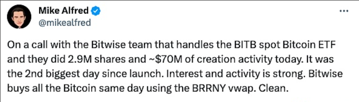 1月18日财经报道,Eaglebrook Advisors创始人Mike Alfred在社交媒体发文称,与负责BITB现货比特币ETF的Bitwise团队通了电话,他们今天发行了290万股,创造了约7000万美元的收益。这是推出以来第二大的交易日。兴趣和活动都很强烈。Bitwise使用BRRNY vwap在当天买入所有比特币。