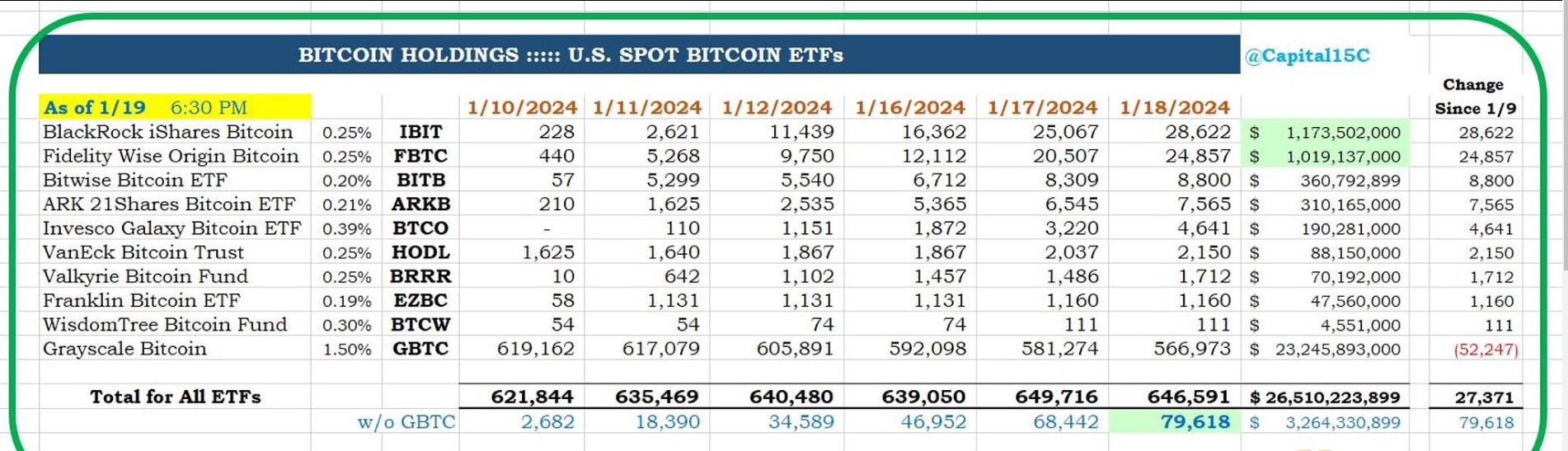 1月20日财经报道,据CC15Capital数据显示,比特币现货 ETF 今天再次成交量巨大,交易量最大的 20 个 ETF 中有 3 个与 BTC 相关,包括 GBTC、BITO(期货 ETF)以及 IBIT。不包括 GBTC 的话,其他 9 支现货 ETF 已在获批的 6 天内购买了 79,618 枚 BTC。 值得注意的是, 贝莱德和富达共买入53,479枚BTC,灰度卖出52,247枚BTC,几乎就像GBTC正在流入贝莱德和富达,而其他7个ETF正在买入剩余灰度卖出的BTC一样。