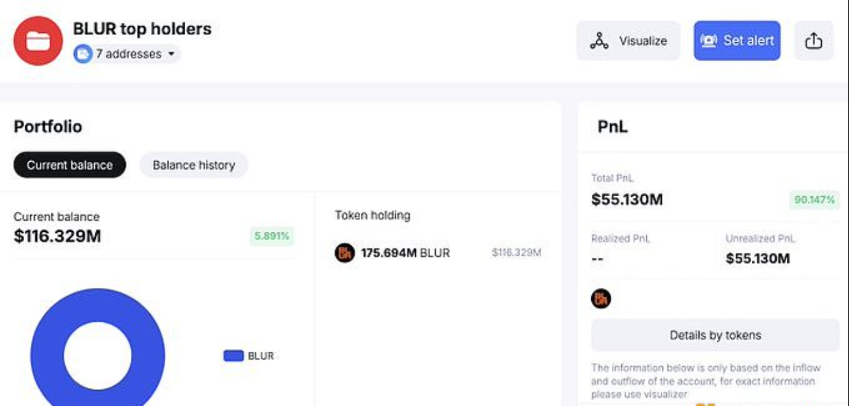 1月24日财经报道,据Spot On Chain监测,自2023年6月以来,7个钱包在每月解锁后大多从Coinbase提取BLUR,并且可能是解锁后看涨的原因。现在,他们仍然持有全部1.757亿BLUR(1.163亿美元),约占总供应量的5.86%。目前这7大BLUR持有者从代币中获得5500万美元的未实现利润。