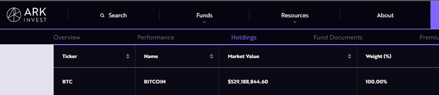 1月29日财经报道,据ARK Invest官方数据显示,截至1月26日本周五,旗下现货比特币ETF ARK 21Shares Bitcoin ETF(ARKB)净资产约为1030万美元,持有比特币的市值达到529,188,844.60美元,约为13,250枚BTC,持仓规模在已批准的现货比特币ETF中位列第五。