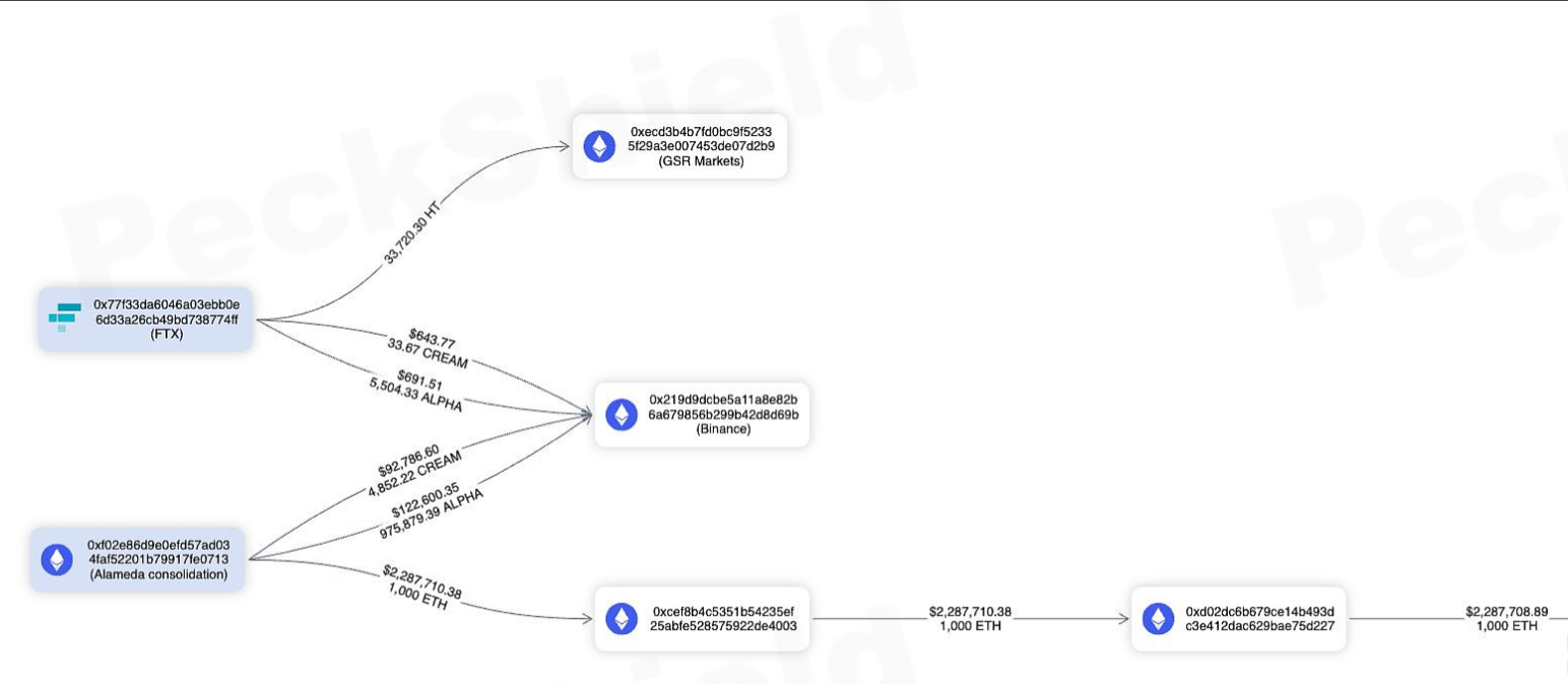 1月30日财经报道,据PeckShield监测,FTX/Alameda地址将1000枚ETH(价值约230万美元)转移到Coinbase,将4.4122万枚CREAM(价值约70.15万美元)转移到Binance,将98.14万枚ALPHA(价值约63.79万美元)转移到Binance和43.54万枚HT(价值约128万美元)转移到GSR Markets的以太坊网络地址上。