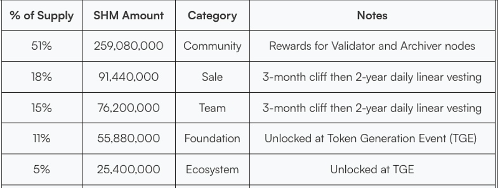 2月3日财经报道,Layer1区块链Shardeum发布空投更新,Shardeum基金会计划分三个阶段分发SHM空投,共2540万枚,其中第1阶段针对早期贡献者(3,661,600枚)、第2阶段针对激励测试网(3,296,500枚)、第3阶段针对主网活动(18,441,900枚)。其中第1阶段将分发3,661,600枚SHM,早期贡献者分为四类:链下贡献者、链上贡献者、开发人员、节点验证者。 Shardeum表示,其代币SHM是实用型代币,用途包括质押、治理、奖励代币、Gas代币和交易费用销毁,SHM的最大供应量为5.08亿。