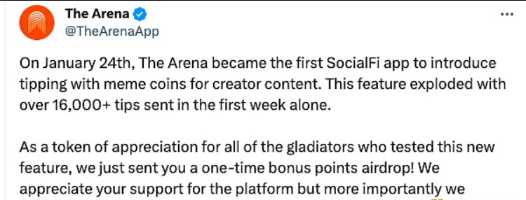 2月4日财经报道,SocialFi协议The Arena发文表示,1月24日,The Arena成为第一个为创作者内容引入模因币小费的SocialFi应用。此功能仅在第一周就发送了超过16,000条提示,数量激增。为了感谢所有测试这一新功能的角斗士,将向测试者发送一次性奖励积分空投。