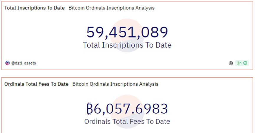 2月4日财经报道,Dune数据显示,比特币NFT协议Ordinals铭文铸造的累计费用收入已突破6000 BTC,本文撰写时达到6,057.6983 BTC,约合261,246,855美元。当前铸造铭文总量触及59,451,089枚。