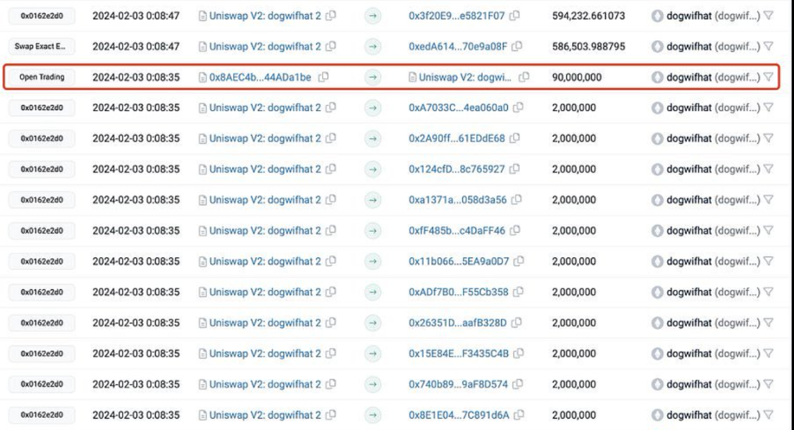 2月4日财经报道,Lookonchain监测数据显示,12个新钱包(内部人士)在dogwifhat上仅用1.6枚ETH(3,694美元),获利770枚ETH(177万美元)。这些钱包是昨天创建的,并在部署者开启交易的同一区块中购买dogwifhat。12分钟后其他用户开始购买dogwifhat。 这12个钱包花费1.6枚ETH(3,694美元)购买2400万个dogwifhat,并以771.86枚ETH(178万美元)的价格卖出了1534万枚dogwifhat。 他们还剩下865万枚dogwifhat(83.8万美元)。