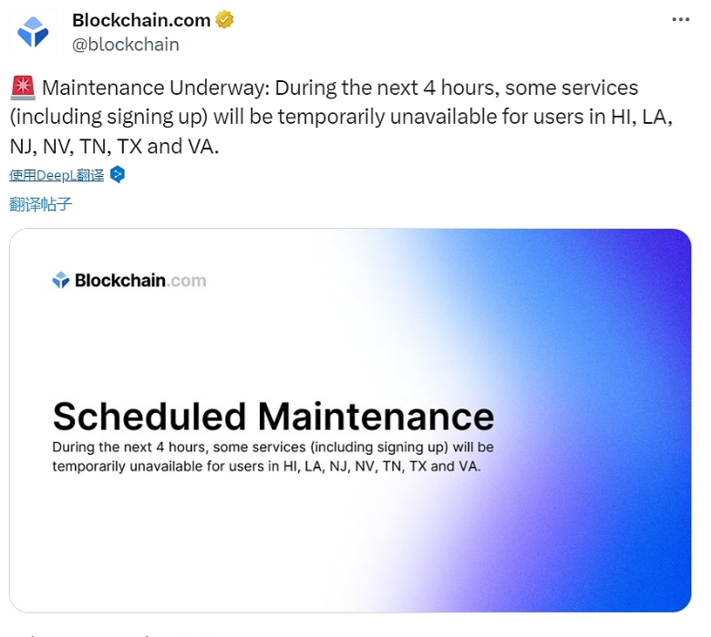 2月6日财经报道,Blockchain.com在社交媒体宣布目前正在维护中,夏威夷州、洛杉矶、新泽西州、内华达州、田纳西州、德克萨斯州和弗吉尼亚州的用户将暂时无法使用某些服务(包括注册)。