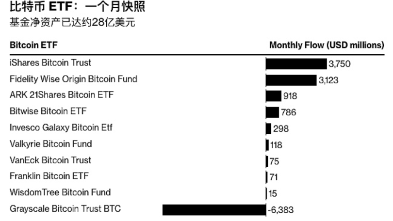2月13日财经报道,在历史性推出一个月后,ETF内部人士和加密货币支持者都表示,比特币现货ETF在关键交易指标上取得了明确的成功。彭博资讯汇编的数据显示,在大约21个交易日内,这些基金的净流入总额约为28亿美元。这包括灰度比特币信托基金(股票代码GBTC)从信托基金转换为交易所交易基金后,投资者撤资64亿美元。位居排行榜首位的是 BlackRock 的 iShares Bitcoin Trust ( IBIT ) 和 Fidelity Wise Origin Bitcoin Fund ( FBTC ),分别吸收了约 38 亿美元和 31 亿美元的资金流入。两者均在五天或更短的时间内突破了 10 亿美元的门槛。据 BI 称,它们也是 ETF 领域中仅有的两只在上市后 20 天的交易中吸引了超过 30 亿美元资金的基金。 彭博社数据显示,根据流量和交易量指标,在过去 30 年大约 5,500 只新 ETF 发行中,IBIT 和 FBTC 稳居前 0.1%。