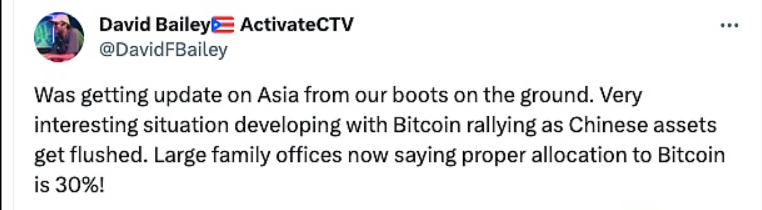 2月13日财经报道,Bitcoin Magazine首席执行官David Bailey在X上发文称,我们正在实地了解亚洲的最新情况。随着中国资产的涌入,比特币的上涨正在发生非常有趣的情况。大型家族办公室现在表示,比特币的合理配置是 30%。