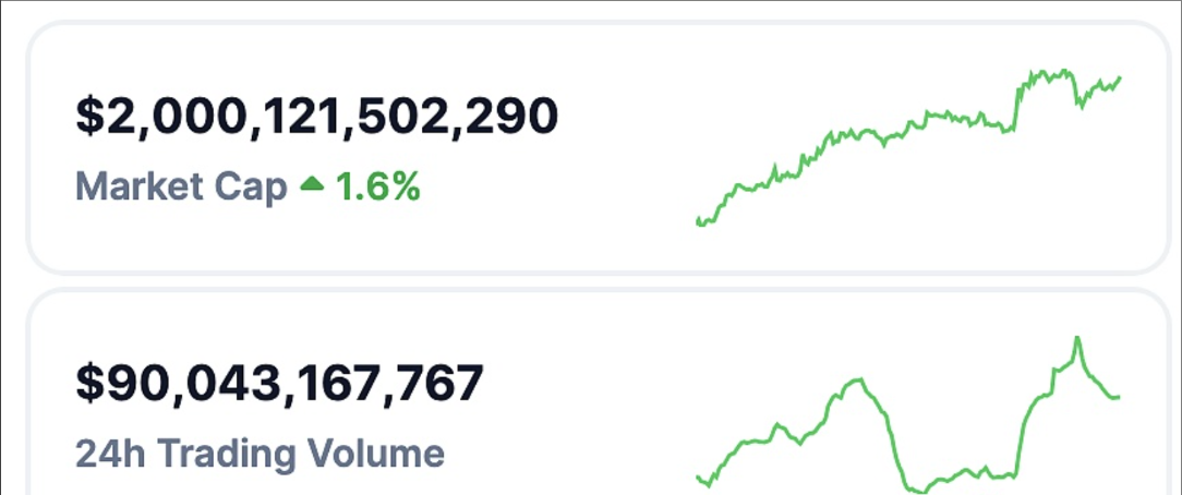 2月15日财经报道,数据显示,目前加密货币总市值已突破两万亿美元,目前为2,000,121,502,290美元,24小时涨幅为1.6%,24小时交易额为90,043,167,767美元。