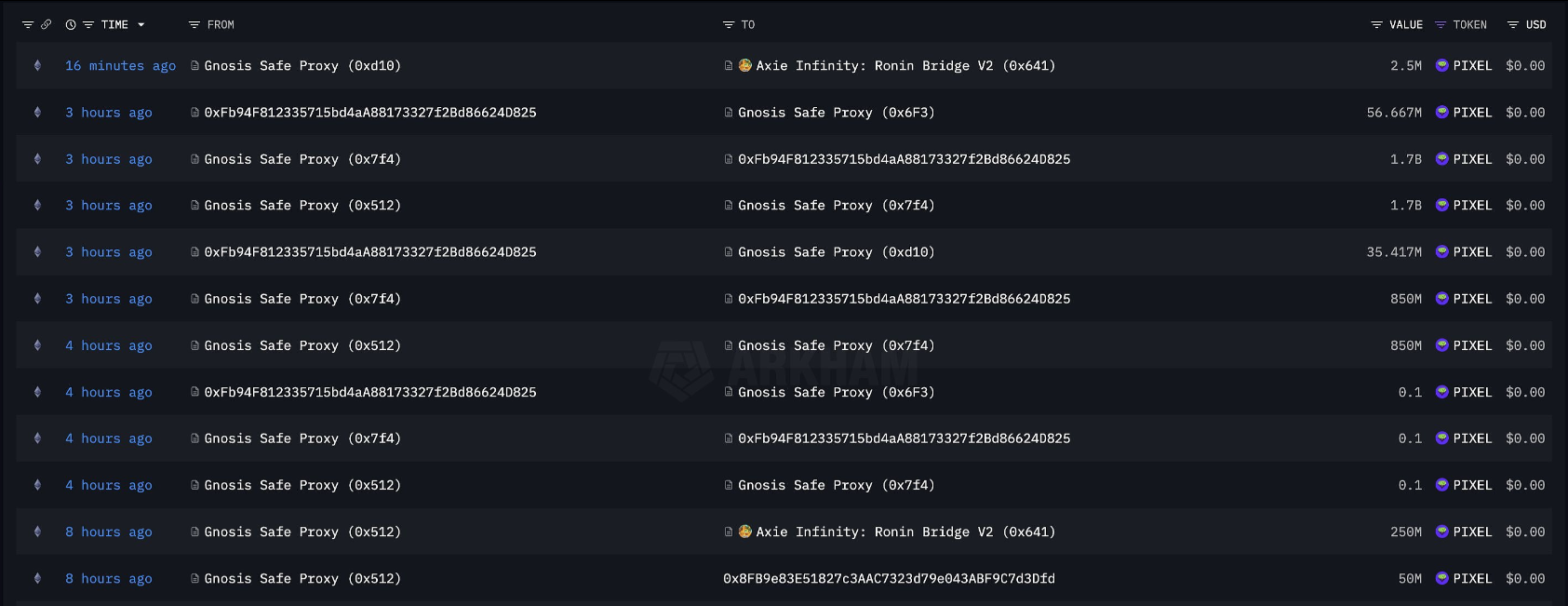2月17日财经报道,据@ai_9684xtpa监测,PIXEL上线倒计时两天,项目方开始分发代币了,其中: 2.5亿枚代币(5%)跨链至 Ronin 网络,用于游戏玩家申领 PIXEL; 17亿枚代币(34%)转移至多签地址,用于生态建设; 8500 万枚代币(17%)转移至多签地址,为财库所用; 5000 万枚代币(1%)转移至新地址 0x8FB…d3Dfd,疑似用于做市。