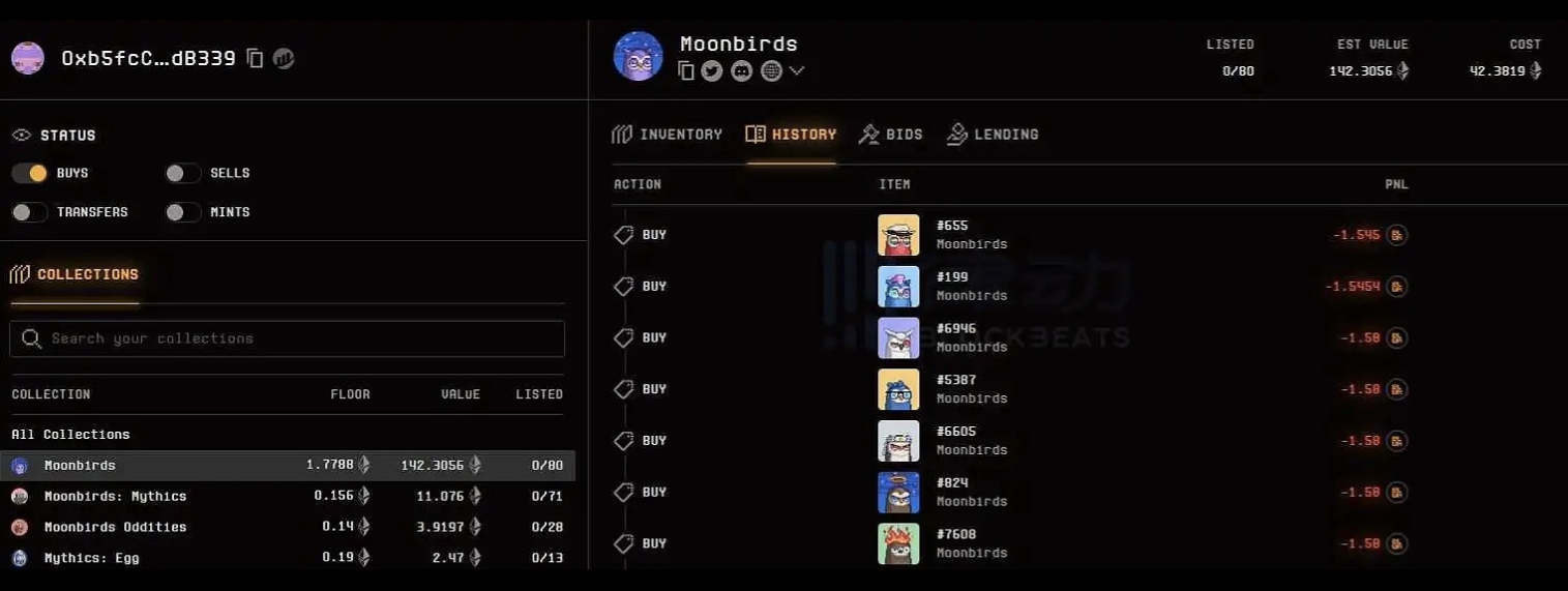 2月17日消息,据Blur行情信息,0xb5fc开头地址于四天前从Bybit收到70枚ETH后,大量买入MoonbirdsNFT,仅2月13日一天,即买入37枚Moonbirds NFT,买入均价约为1.08ETH。后该地址将部分Moonbirds NFT进行抵押借贷,同时继续买入Moonbirds及相关NFT系列。 截止发稿,该地址当前共持有80枚MoonbirdsNFT、71枚Moonbirds:Mythics、28枚Moonbirds Oddities以及13枚Mythics:Egg。 今日消息,Bored Ape Yacht Club开发团队Yuga Labs宣布已收购Moonbirds的开发团队Proof。