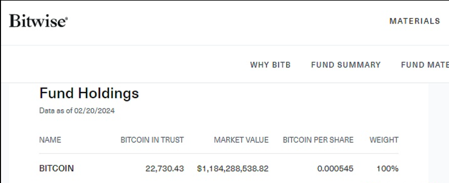 2月21日财经报道,Bitwise官方更新现货比特币ETF持仓数据显示,截至当地时间2月20日BITB总计持有22,730.43枚比特币,较上周末增加约616 BTC,持仓市值达到1,184,288,538.82美元;BITB流通份额升至41,690,000份,每股约0.000545 BTC。