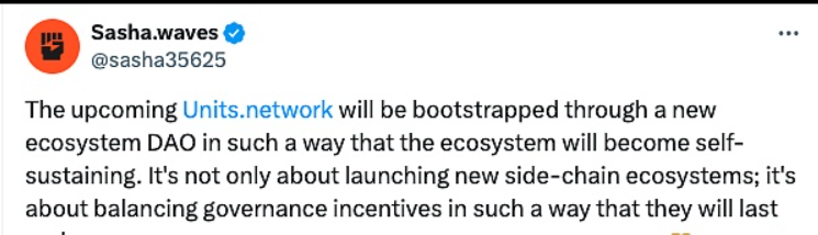 2月26日财经报道,Waves创始人Sasha.waves在其社交平台表示,即将推出侧链网络Units.network,Units.network将通过一个新的生态系统DAO来引导,第一个侧链原生代币Unit0的挖矿代币L2MP将其与信标链节点之一进行质押以获得UNIT0。第一年将开采100万枚代币并分发给L2MP质押者。