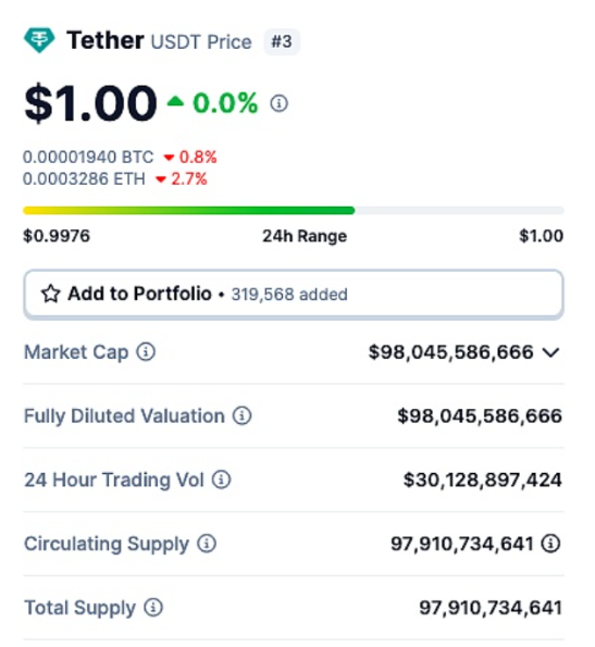 2月26日财经报道,据Coingecko最新数据显示,美元稳定币USDT市值已突破980亿美元,本文撰写时为98,020,425,740美元,续创历史新高。