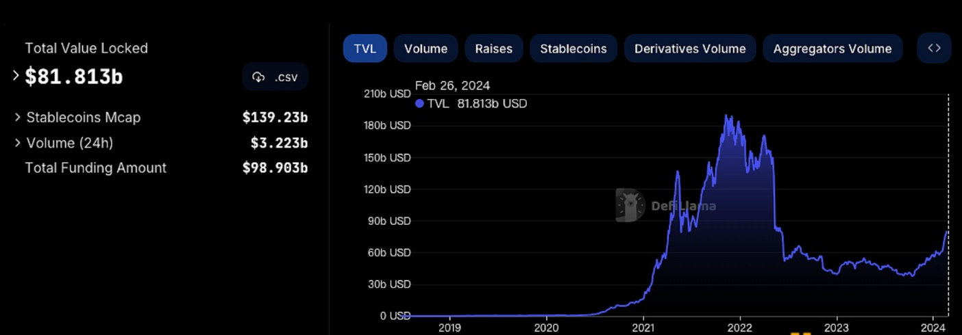 2月26日财经报道,数据显示,DeFi的锁定总价值(TVL)已突破800亿美元关口,达到自2022年5月Terra稳定币垮台以来的新高。