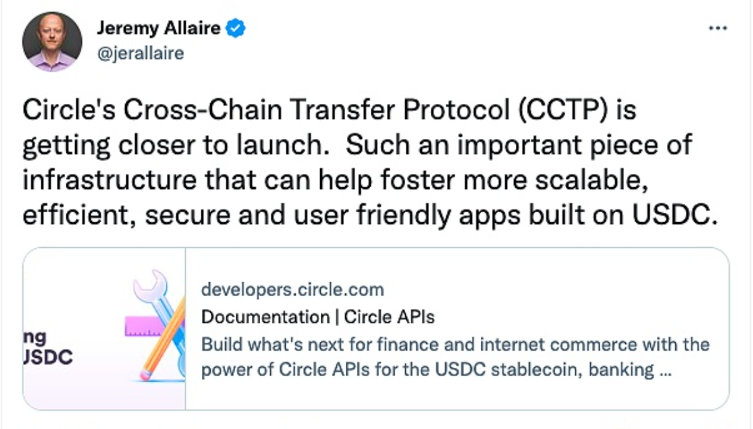 Circle首席执行官Jeremy Allaire在社交媒体上表示,Circle的跨链传输协议 (CCTP) 即将推出。这样一个重要的基础设施,可以帮助培养基于 USDC 构建的更具可扩展性、高效、安全和用户友好的应用程序。