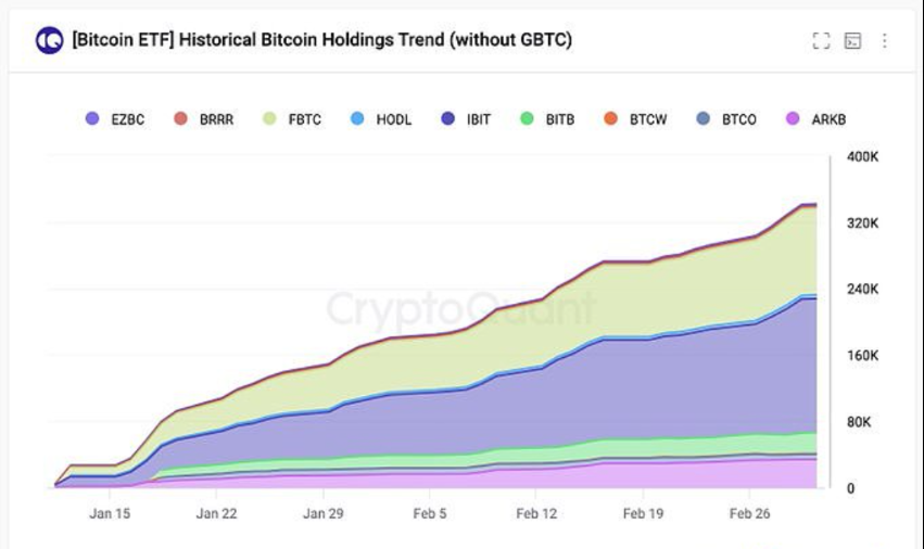 3月4日财经报道,CryptoQuant创始人兼首席执行官Ki Young Ju在社交媒体发文表示,今年我们可能会看到BTC卖方流动性危机。除GBTC外,现货ETF的新增资金月环比增长95%。按照这个速度,今年的比特币持有量可能会超过几百万枚BTC。 交易所、矿工及其附属地址目前持有300万枚BTC。