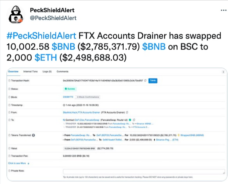 11月16日消息,据派盾预警监测,FTX攻击事件黑客(链上地址被标记为FTX Accounts Drainer)已将BSC上的10002.58枚BNB (约278万美元) 兑换成2000枚ETH (约合250万美元),且0x961b开头的FTX Accounts Drainer地址通过Anyswap桥接了200枚ETH(约合25万美元),FTX Accounts Drainer已将BSC上的11,422.32枚WBNB (约318万美元) 兑换成300万枚BSC-USD (约合300万美元)。