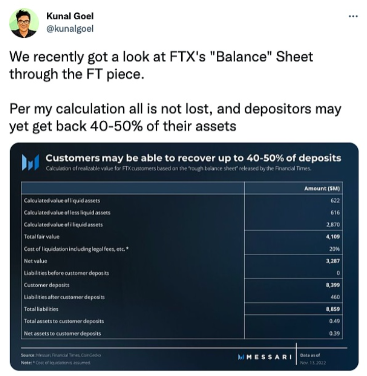 11月16日消息,数据分析机构Messari分析师Kunal Goel撰文称,在研究了FTX的“资产负债表”后,根据其计算,并不是所有的资产都消失了,存款人可能还会收回40-50%的资产。