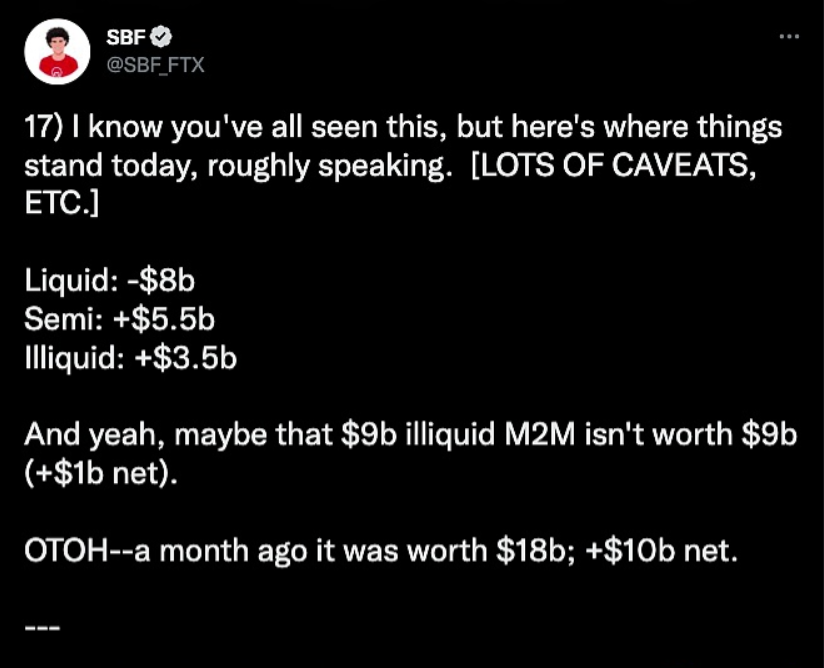 11月16日消息,SBF发文粗略估计目前的情况:拥有流动性资产为-80亿美元;半流动性资产为55亿美元;非流动性资产为35亿美元。SBF表示,或许现在90亿美元半/非流动性资产(按市值计价,10亿美元净值)不值90亿美元。但这些资产在一个月前值180亿美元(100亿美元净值)。