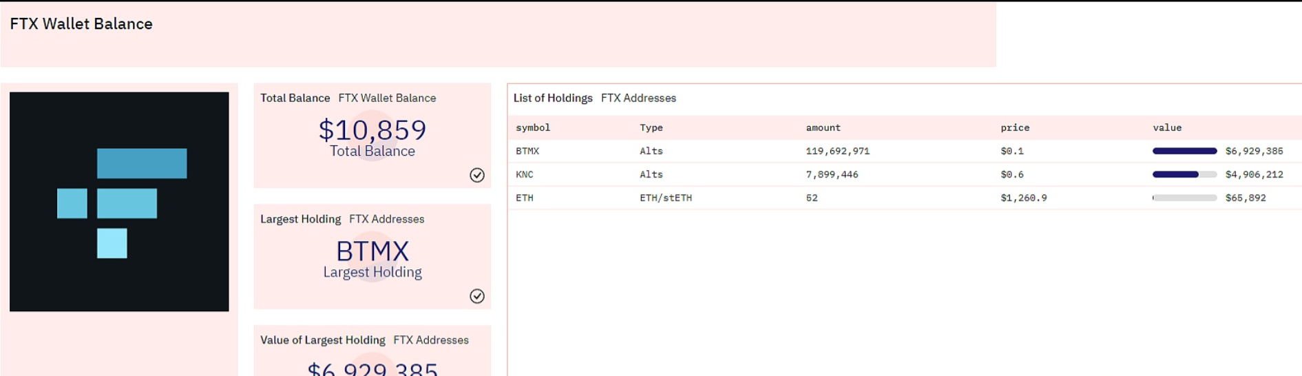 据Dune Analytics数据显示,FTX以太坊链上钱包内的大部分代币已被抛售,当前仅剩下119,692,971枚BTMX,约合6,929,385美元、7,899,446枚KNC,约合4,906,212美元,以及52枚ETH,约合65,892美元,总计为10,859美元.]。