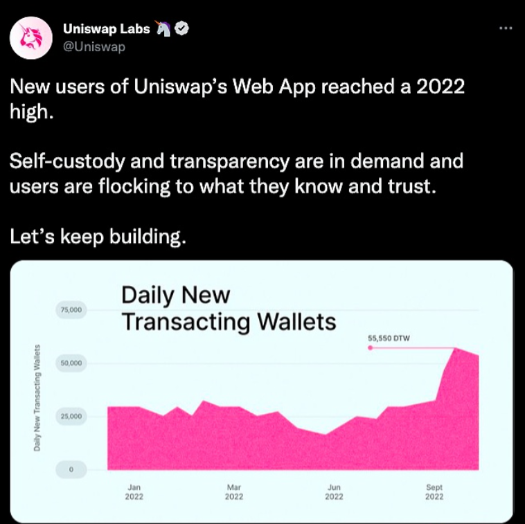 11月16日消息,Uniswap Labs 在其社交平台表示,Uniswap Web App 的每日新增用户数创 2022 年新高。