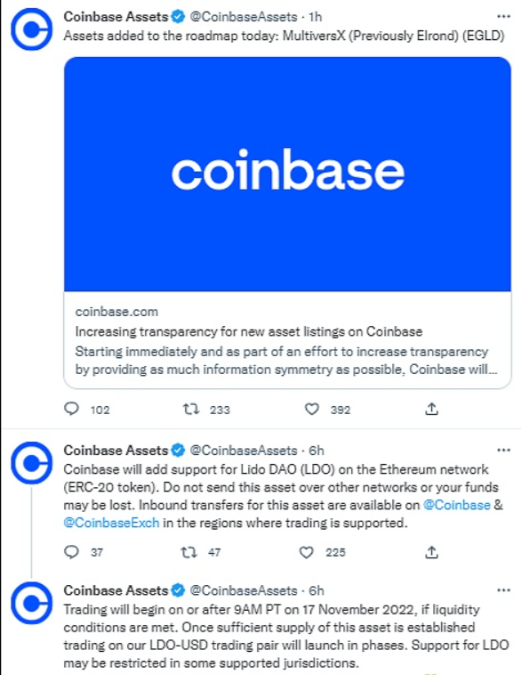 11月17日消息,据官方推特,Coinbase将在以太坊网络(ERC-20代币)上上线Lido DAO (LDO) 。如果满足流动性条件,交易将于太平洋时间11月17日9:00(北京时间11月18日0:00)或之后开始。如果建立了足够的该资产供应,LDO-USD交易对的交易将分阶段开放。 此外,Coinbase宣布将MultiversX(原Elrond)的EGLD代币添加至资产上线路线图。