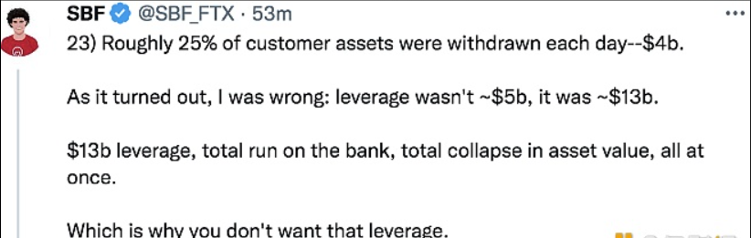 FTX创始人SBF在推特发文称,一个月前FTX是一家有价值的企业。FTX的日交易量约为100亿至150亿美元,年收入约为10亿美元,股权价值高达400亿美元。FTX被誉为高效经营公司的典范,是硅谷的宠儿。但过于自信和粗心大意导致问题不断酝酿。随后几天内发生了历史性崩盘,大多数相关资产暴跌超过50%。与此同时,发生了挤兑,每天大约有25%的客户资产被取出。杠杆高达130亿美元,而不是此前认为的50亿美元。高杠杆、资金挤兑、资产价值的全面崩盘突然同时发生。