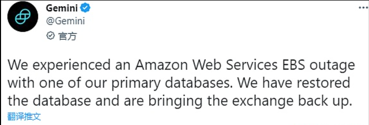 据官方消息,Gemini表示其某个主要数据库与Amazon Web Services EBS服务链接中断,其已经恢复了数据库并正在恢复数据交换。 此前报道,Gemini部分系统服务出现中断,官方称客户资金安全。
