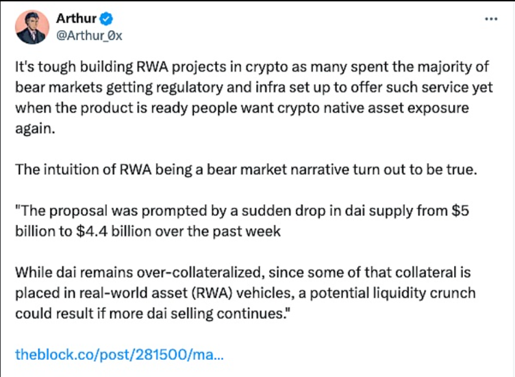 3月10日财经报道,DeFiance Capital创始人兼CEO Arthur Cheong在社交平台表示,在加密货币中建立RWA项目是很困难的,因为许多人在熊市的大部分时间里都在建立监管和基础设施,以提供此类服务,但当产品准备就绪时,人们又希望接触到加密货币的原生资产。RWA在熊市中的直觉被证明是正确的。 过去一周,dai供应量从50亿美元骤降至44亿美元,这促使我们提出了这项建议。虽然代币仍被过度抵押,但由于其中一些抵押品被置于RWA工具中,如果更多的代币抛售继续下去,可能会导致潜在的流动性紧缩。