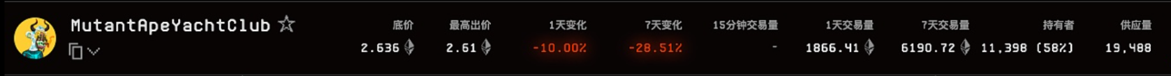 3月10日财经报道,Blur数据显示,Mutant Ape Yacht Club(MAYC)地板价持续走低,目前为2.64ETH,再创历史新低,单日下跌10%,近7日下跌达28.51%。MAYC总量2万枚,其中1万枚通过荷兰式拍卖以3 ETH初始价格公开发售,筹集到约2.8万ETH(当时价值约9600万美元),另外1万枚空投给了BAYC持有者。