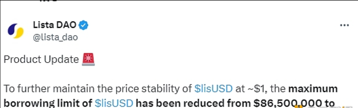 3月14日财经报道,BSC生态稳定币项目Lista DAO发布产品更新,为了进一步将lisUSD的价格稳定在1美元左右,lisUSD的最高借款限额已从86,500,000枚降低至69,000,000枚lisUSD。