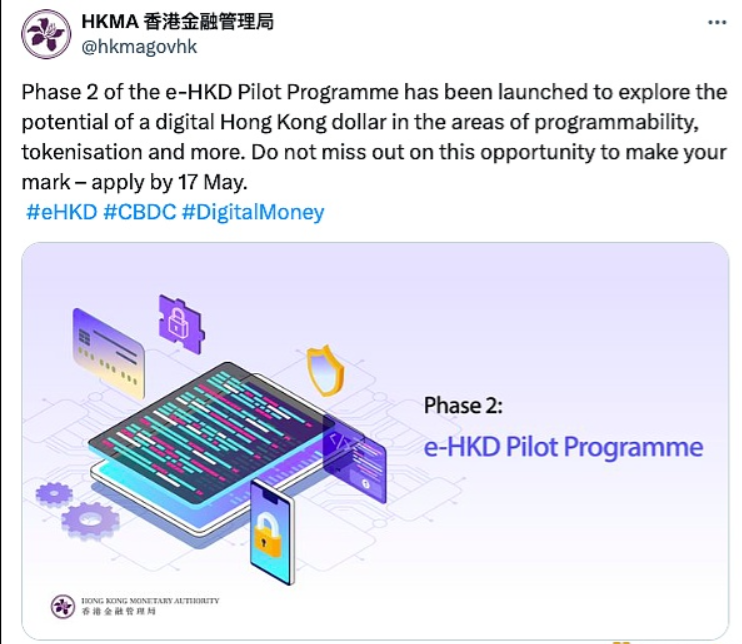 3月15日财经报道,香港金融管理局表示,数字港元(e-HKD)试验计划第二阶段已经启动,以探索数字港元在可编程性、代币化等领域的潜力。试点企业请在5月17日前提出申请。