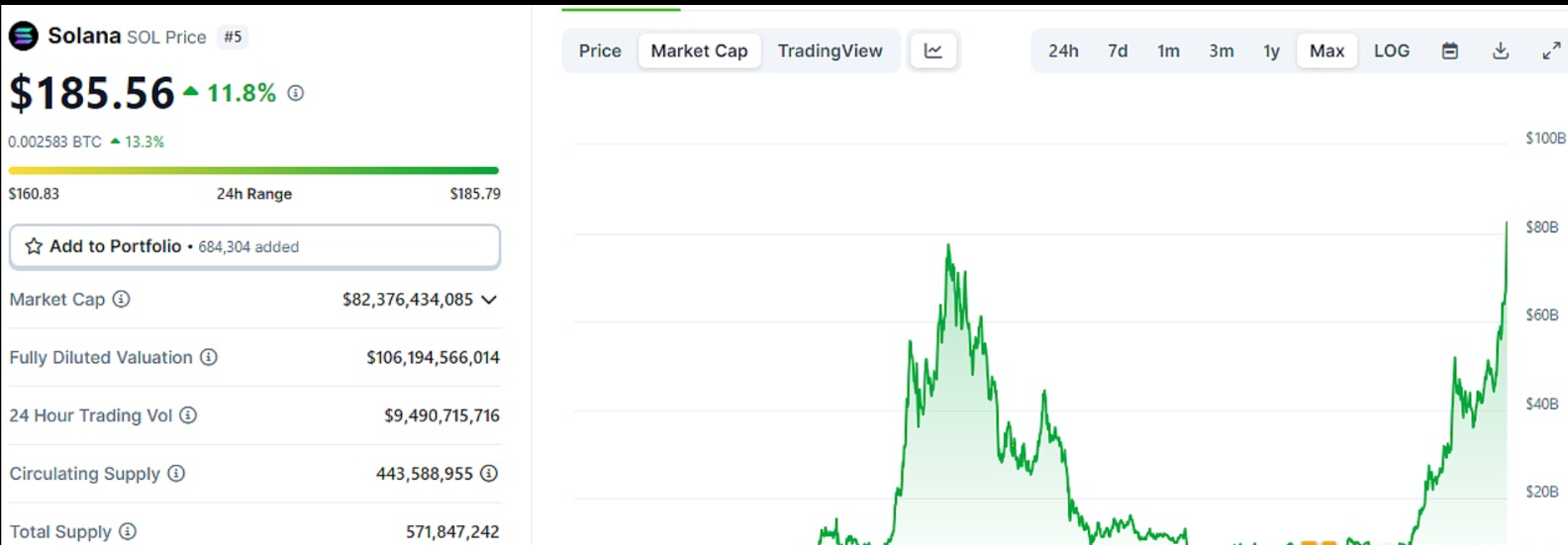 3月15日财经报道,随着Solana(SOL)价格突破185美元,其市值也突破800亿美元,Coingecko数据显示,本文撰写时Solana市值达到823.7亿美元,创下历史新高。Solana市值此前触及的高点发生在 2021 年 11 月,约为 779 亿美元。