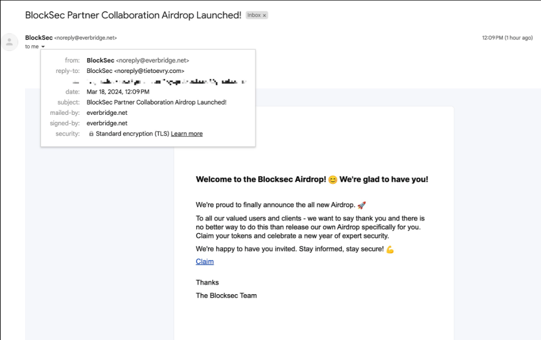 3月18日财经报道,区块链安全公司BlockSec发推称,约一小时前,一封声称来自BlockSec的网络钓鱼电子邮件已发送给众多用户。官方表示,其并未发布空投,电子邮件不是由其发送的,用户切勿点击任何链接,以造成资产损失。 经调查,网络钓鱼电子邮件是由于MailerLite数据泄露造成的,且该网络钓鱼的范围仅限于1月23日MailerLite安全事件之前在Phalcon/Meta Sleuth注册的用户。目前官方已删除MailerLite平台上的所有用户数据。