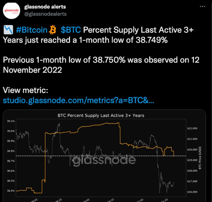 据Glassnode数据显示,BTC供应百分比最近活跃3年以上达一个月低点,数额为38.749%。