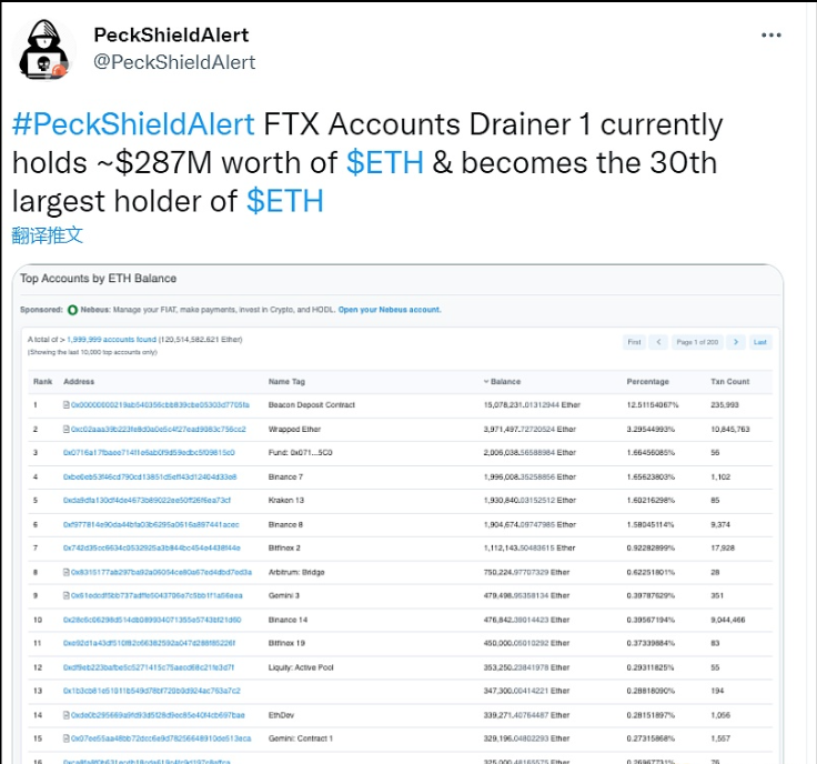 据派盾监测,FTX攻击地址(以“0x59ab”开头)目前持有价值约2.87亿美元的ETH,成为ETH的第30大持币地址。