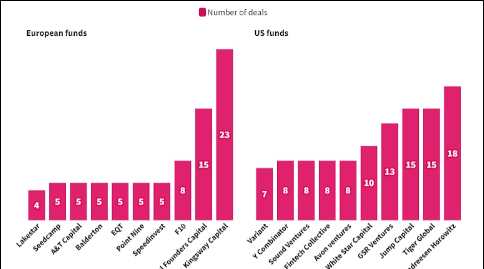 市场分析平台 Dealroom 对 2021 年和 2022 年美国和欧洲基金的加密货币投资交易进行了分析,结果显示,总部位于伦敦的投资公司和对冲基金基金 Kingsway Capital 是近两年加密投资交易最多的机构,总计有 23 笔交易,其他投资数量较多的欧洲机构包括Global Founders Capital(15 笔交易)、Speedinvest(5 笔交易)和 Balderton(5 笔交易)。在美国市场里,近两年加密投资交易最多的机构是 a16z(18 笔),其次是 Tiger Global 和 Jump Capital(均为 15 笔),GSR Ventures 的投资交易数量为 13 笔。