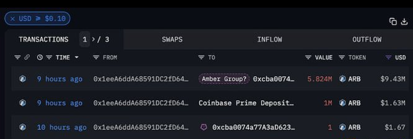 3月20日财经报道,据链上分析师@ai_9684xtpa监测,过去九小时,Amber Group开始大额转移ARB,它将100万枚ARB充值进Coinbase,价值163万美元;将582万枚ARB转移至地址0xcba…a8bab并进行Coinbase充值测试,或即将转至交易所。 目前地址0x1ee…94dF4的ARB已全部转出,2024年累计向交易所充值854万枚ARB,价值1629万美元。