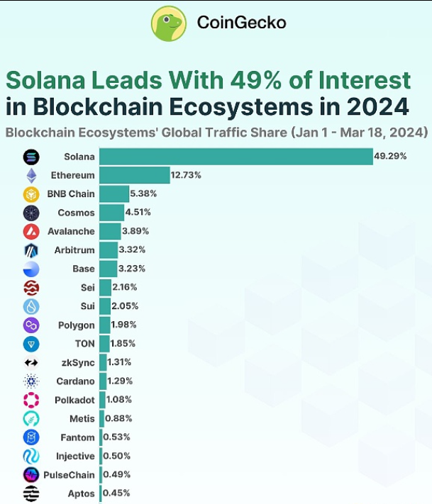 3月21日财经报道,CoinGecko公布了今年最受欢迎的20个区块链生态系统的排名。Solana名列榜首,以49.3%的投资者兴趣领先,而以太坊和BNB Chain分别位居第二和第三,吸引了12.7%和5.4%的投资者关注。 具体排名如下:1.Solana 2.以太坊 3.BNB Chain 4.Cosmos 5.Avalanche 6.Arbitrum 7.Base 8.Sei 9.Sui 10.Polygon 11.TON 12.zkSync 13.Cardano 14.Polkadot 15.Metis 16.Fantom 17.Injective 18.PulseChain 19.Aptos 20.Hedera。