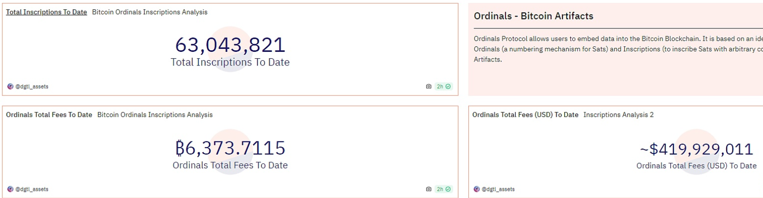 3月23日财经报道,Dune数据显示,比特币NFT协议Ordinals铭文铸造的累计费用收入为6,373.7115 BTC,约合419,929,011美元;当前铸造铭文总量已突破6300万枚,达到63,043,821枚。