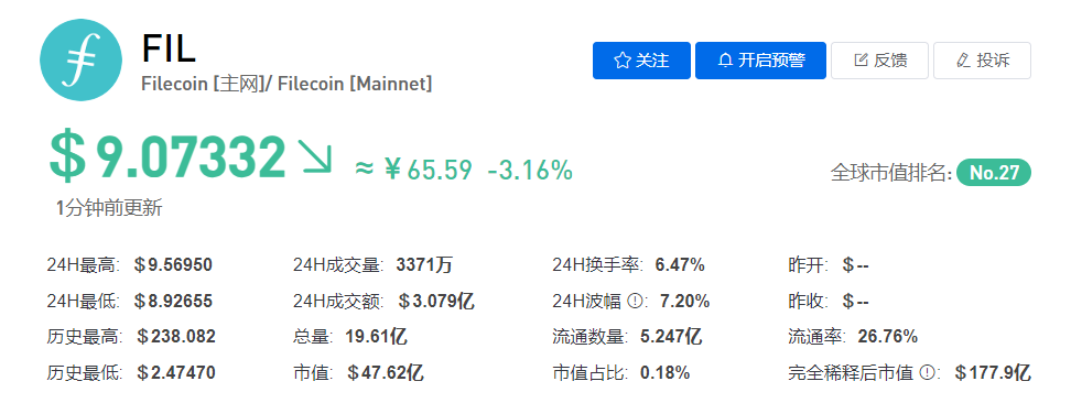 Filecoin [主网]今日价格为$9.08,其24小时的交易量为$30792.7万。Filecoin [主网]在过去24小时内下跌了3.16%。目前市值排名为第27位,其市值为476216万USD。其流通总量为52473.4万FIL,其发行量为196083万FIL。