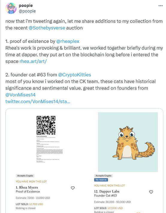 3月31日财经报道,Doodle创始人poopie在社交媒体披露,自己最近从苏富比拍卖中购得两件NFT,分别是数字艺术家Rhea Myers的“proof of existence”和CryptoKitties系列的cat#63,据相关交易截图显示,“proof of existence”价格约为1.27万美元,而Cat#63售价约为12.7万美元。据OpenSea数据显示,当前CryptoKitties的地板价约为0.0015 ETH。