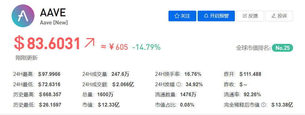 AAVE币今日价格为$83.42,其24小时的交易量为$20669.6万。AAVE在过去24小时内下跌了14.41%。目前市值排名为第25位,其市值为123135万USD。其流通总量为1476.10万AAVE,其发行量为1600万AAVE。