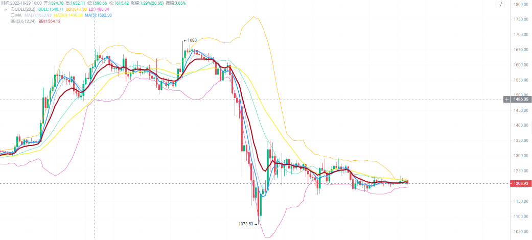 ETH方面:日级别来看,以太的波动相比较于大饼更强烈明显一些,阳十字星的走出也不是特别的标准,无明确信号,币价依旧维持在布林带中下轨运行,同样上方BBI多空线17200一线强力压制,行情弱势延续,更别说突破MA30均线了;4小时级别来看布林带在早盘的拉升当中又有形成箱体形态的迹象,那么日内大概率会再度横盘,多头一直受上轨压制动能也逐渐薄弱,虽说早盘多头有小幅度反弹但并没有起到太大作用 横盘依然没有被打破,短期上方压力1230一线,下方支撑1190一线,日内维持此区间进行高抛低吸即可。