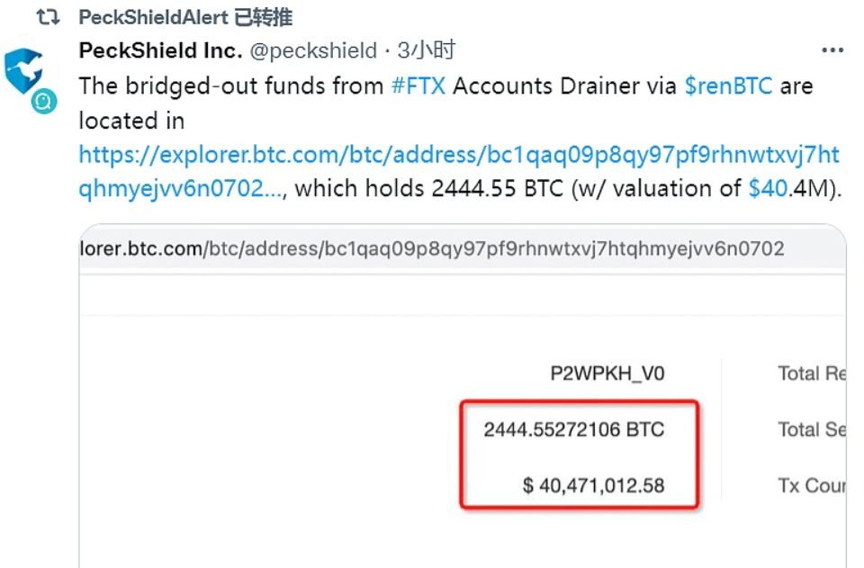 11月21日消息,派盾(PeckShield)监测显示,FTX黑客通过renBTC将资金桥接至比特币网络,目前该比特币地址拥有约2444枚比特币(约4040万美元)。此前报道,FTX黑客将2.5万枚ETH并抛售兑换为renBTC,该地址仍然剩余200735枚ETH。