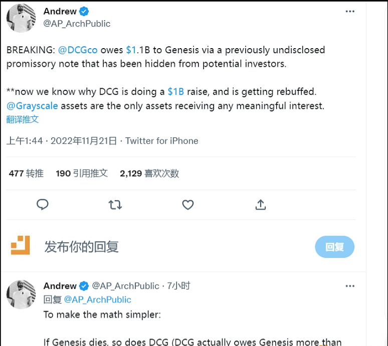 11月21日消息,推特用户Andrew发推表示,Digital Currency Group(DCG)通过一张此前未披露的、对潜在投资者隐藏的本票,对子公司Genesis欠款超11亿美元,并要求不要披露。 此前报道,Genesis正在向投资方寻求10亿美元紧急贷款,理由是由于其资产负债表上的某些流动性不足的资产导致发生流动性紧缩情况。DCG疑似近日删除其团队、董事会成员、董事会顾问的姓名、职位和图片等信息。