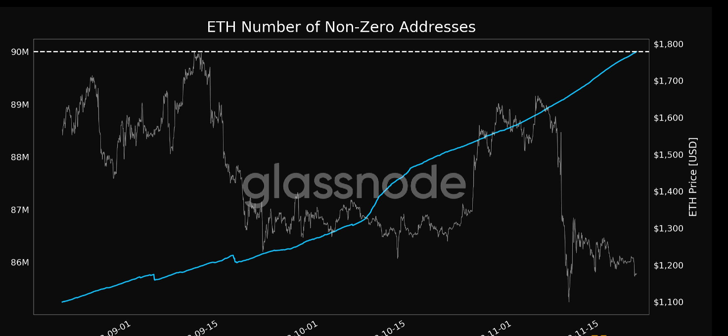 据Glassnode数据显示,ETH非零地址数刚刚超过90,000,000个。当前值为90,000,555个,再创历史新高。