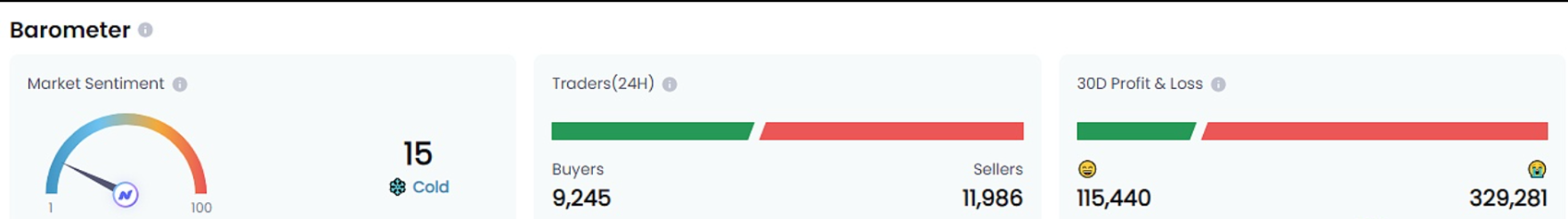 据NFTGo数据显示,当前NFT市场情绪指数为15,等级为“Cold”。近24小时NFT市场买家地址数量为9,245个,卖家地址数量为11,986个。近30天盈利地址数量为115,440个,亏损地址数量为329,281个。 注:NFT市场情绪指数(实验性)是根据波动率、交易量、社交媒体和谷歌趋势计算得出的。